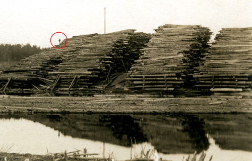 The photo here is a detail view of log piles along the Saco River from a postcard. I’ve circled the guy standing up top so you can get a sense of the enormity of the piles. Dangerous work that was, no doubt about it.