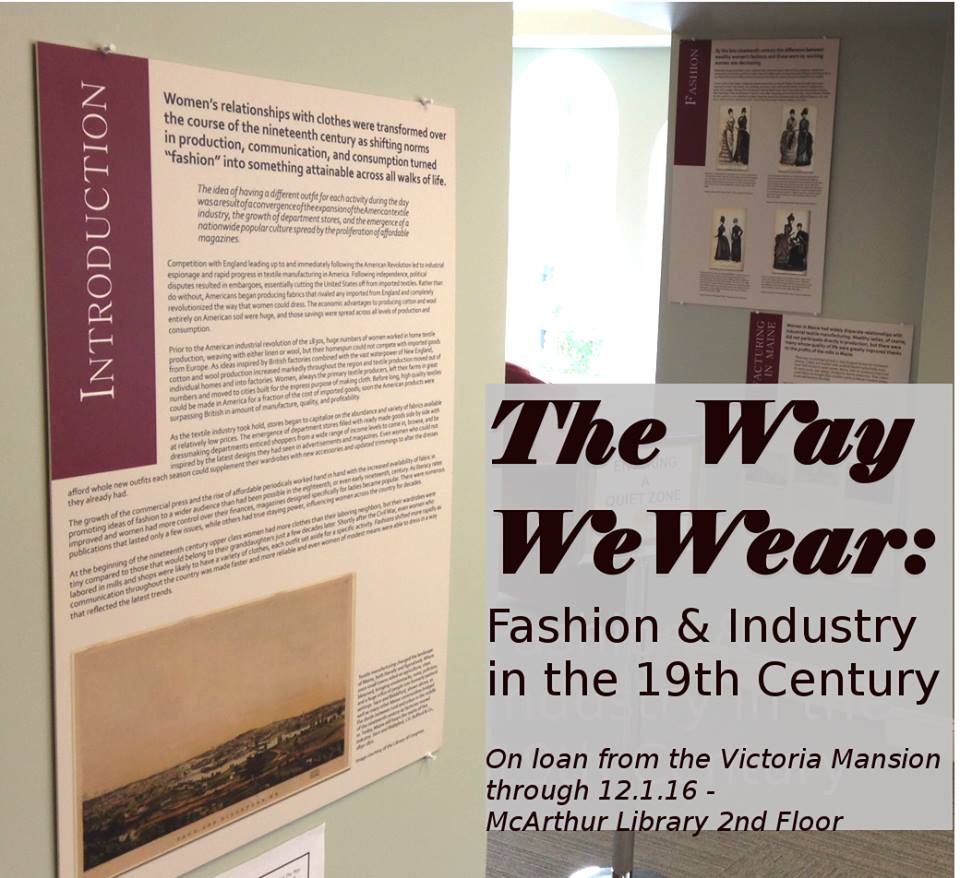 The exhibit, “The Way We Wear: Fashion & Industry in the 19th Century“, was on view at the Victoria Mansion Carriage House Gallery through the 2016 season, and featured materials from numerous organizations, including McArthur Library.