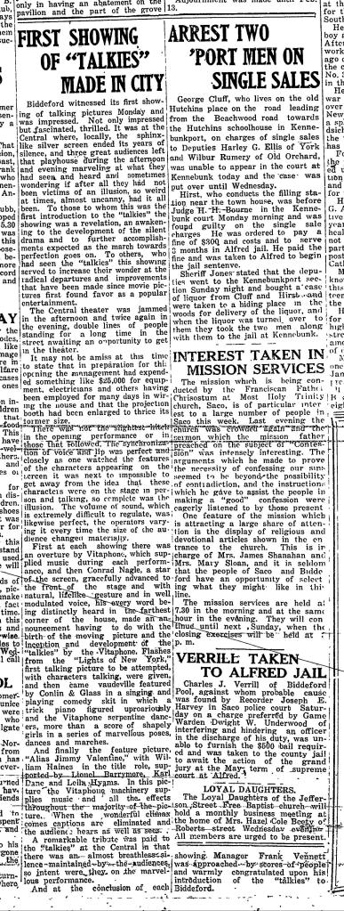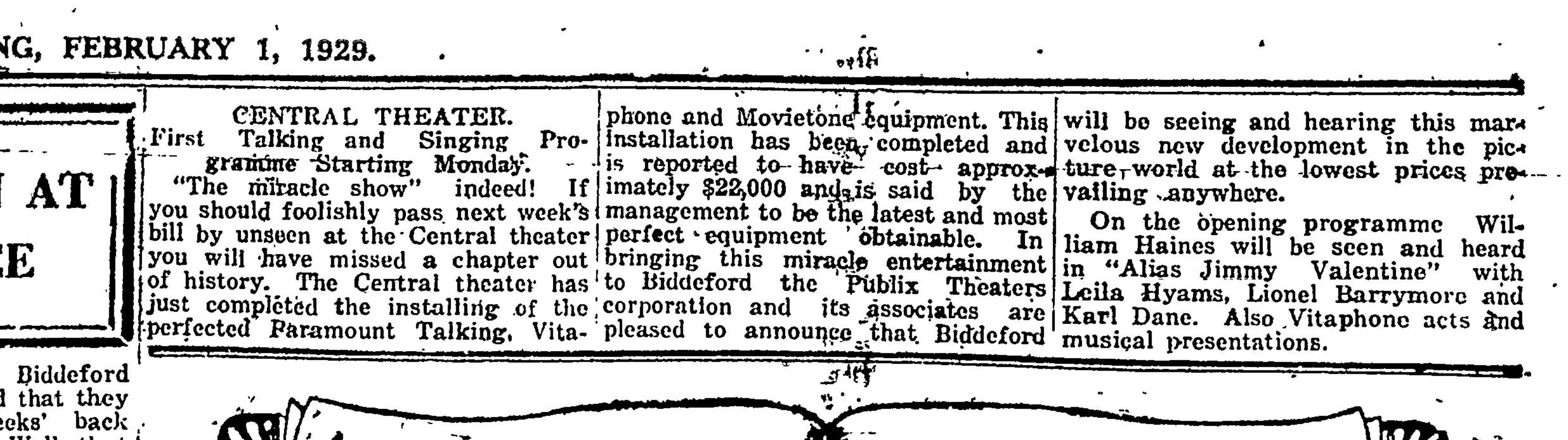 It played at the Central Theater (now location of Biddeford Police Department) and opened Monday, February 4, 1929.