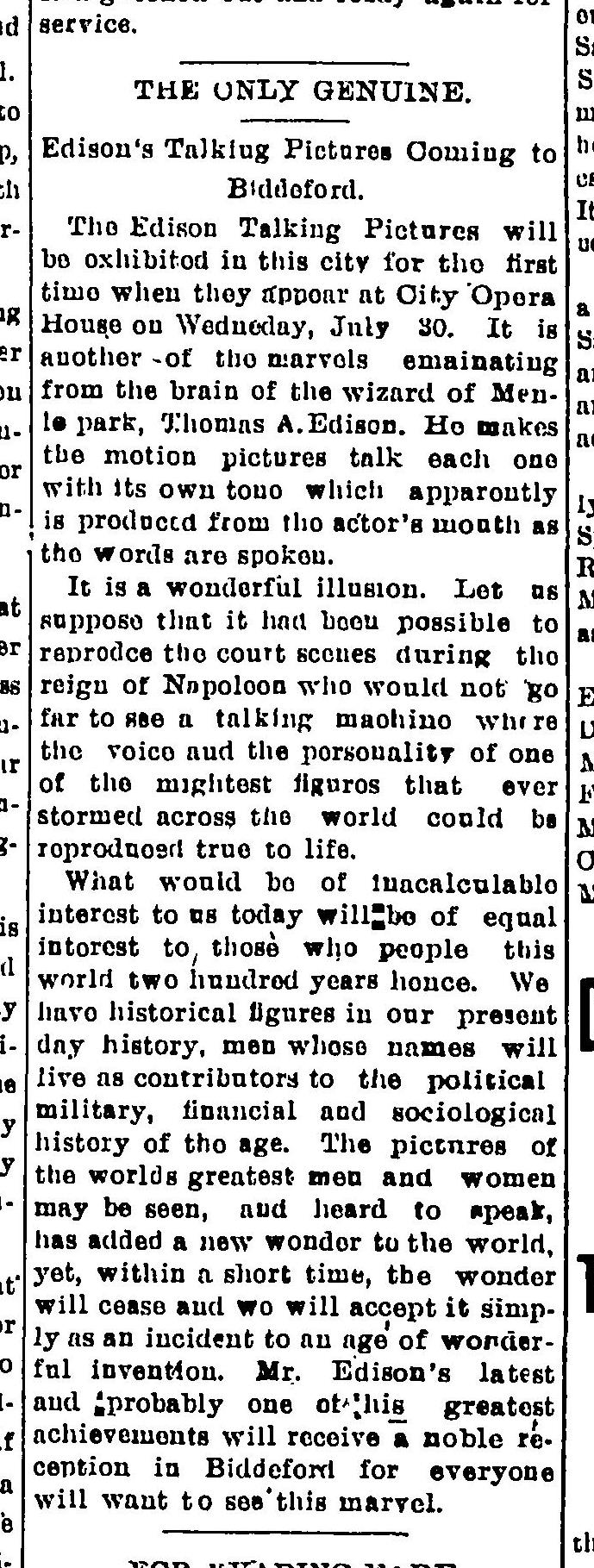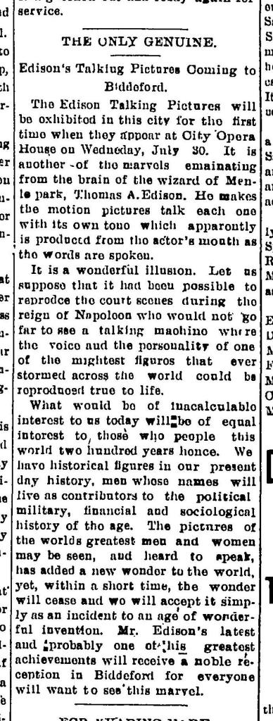 There seems to have been much earlier “expositions” made of films that included sound, the earliest found so far states that an exposition of Thomas Edison’s Talking Pictures would be shown at the City Opera House on Wednesday, July 30, 1913. No follow up reporting appeared in the following two weeks, so we don’t know if it went over well or not!