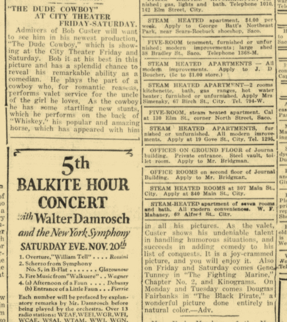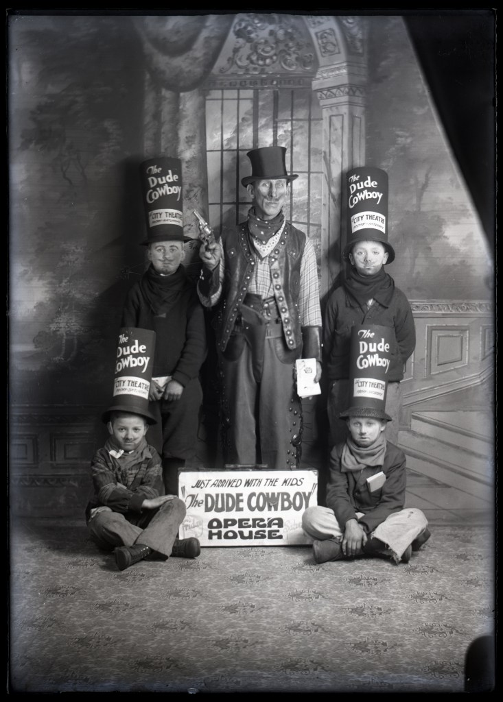 This great picture was discovered several years ago in our collection, but with no background info it was a bit of a mystery – known to be taken in Biddeford, something to do with City Theater, but the year and detailed information were unknown. What kind of show was Dude Cowboy? What’s the story?